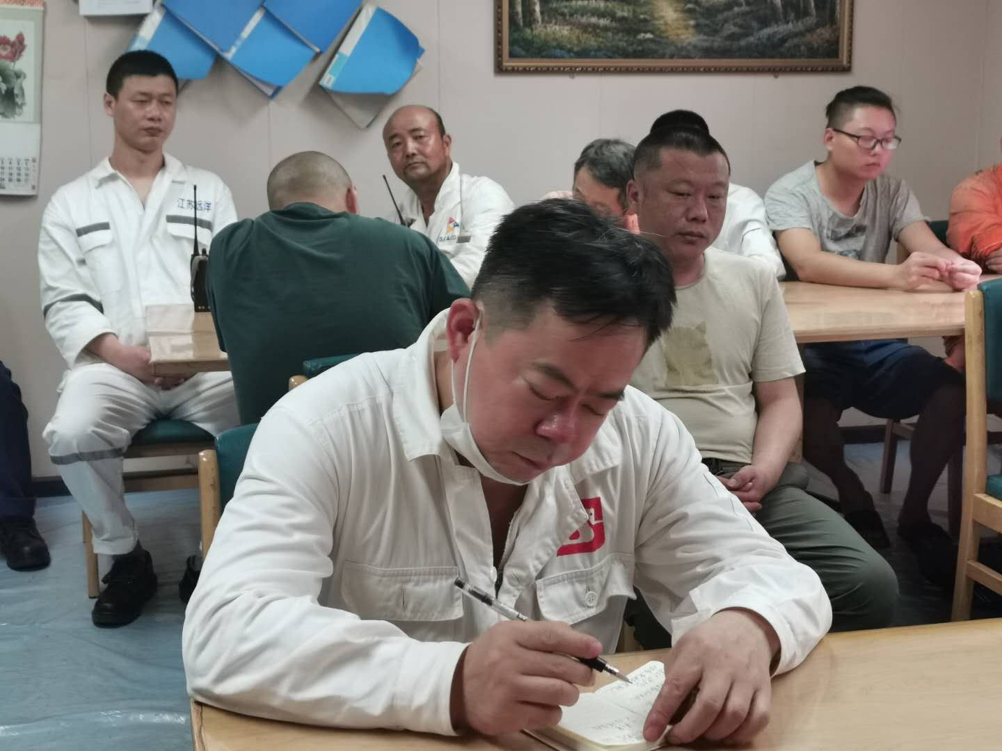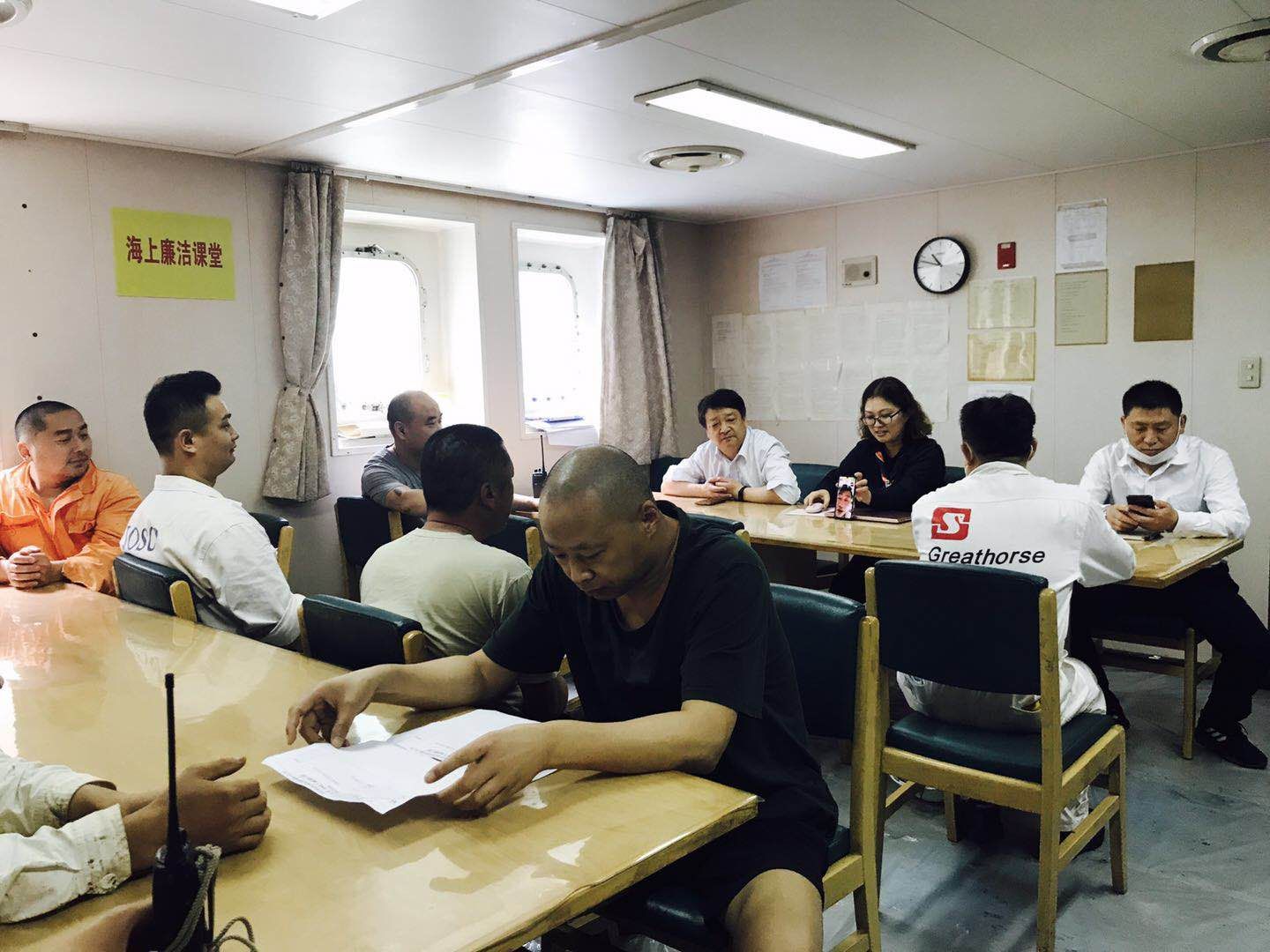本次學習還特別視頻連線了公司黨委書記、董事長晁陽。晁書記親切問候了全體船員并肯定大家的努力與良好的精神面貌;提醒大家把工作重點放在“外防輸入,內(nèi)防反彈”上,進一步加強遠洋船舶疫情防控工作,做到疫情防控力度不減、勁頭不松;希望大家在特殊時期要同心同德,積極構(gòu)建船舶安全生產(chǎn)、疫情防控、班組建設(shè)三位一體格局。最后,晁書記祝愿全體船員工作順利。