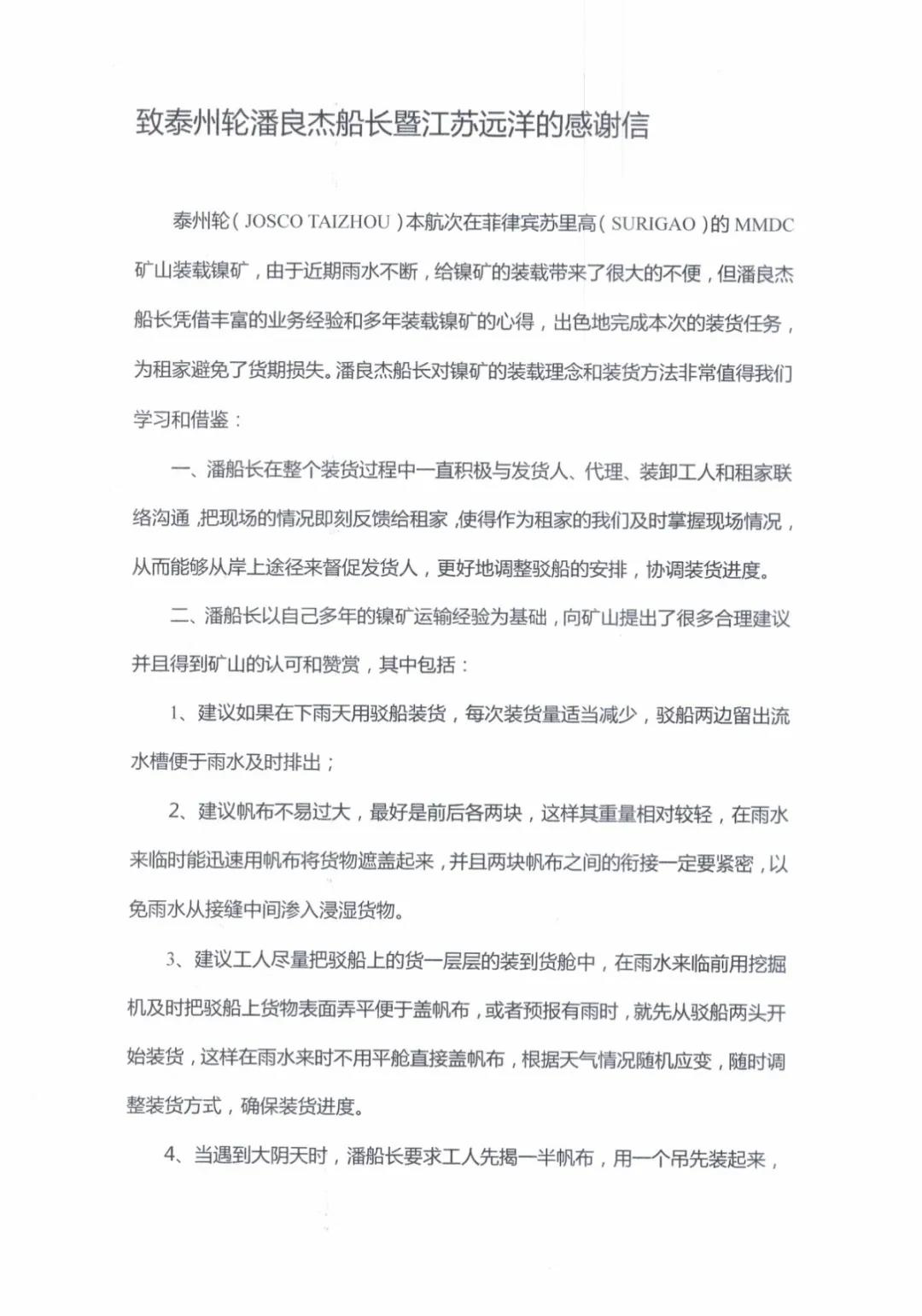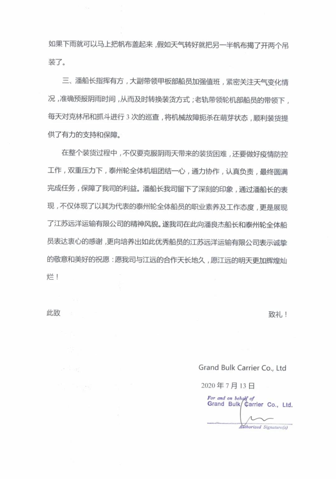 7月13日,江蘇遠(yuǎn)洋航運(yùn)部、“江遠(yuǎn)泰州”輪同時(shí)收到租家GBC公司發(fā)來(lái)的感謝信。信中指出,泰州輪潘良杰船長(zhǎng)有著“豐富的業(yè)務(wù)經(jīng)驗(yàn)”、“指揮有方”,全體機(jī)組“團(tuán)結(jié)一心,通力協(xié)作,認(rèn)真負(fù)責(zé)”,“保障了我司的利益”、“我司留下深刻的印象”,對(duì)此表示“衷心的感謝”、“誠(chéng)摯的敬意和美好的祝愿”。