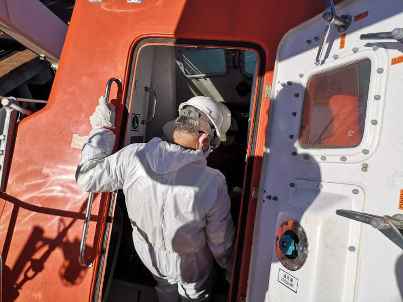 8月6日上午0820LT,梯口值班報(bào)告,有4名身穿防護(hù)服的人員在我輪舷邊由船尾向船首方向邊走邊不時(shí)交流,防護(hù)服沒有任何標(biāo)志,懷疑是PSC檢查官員。